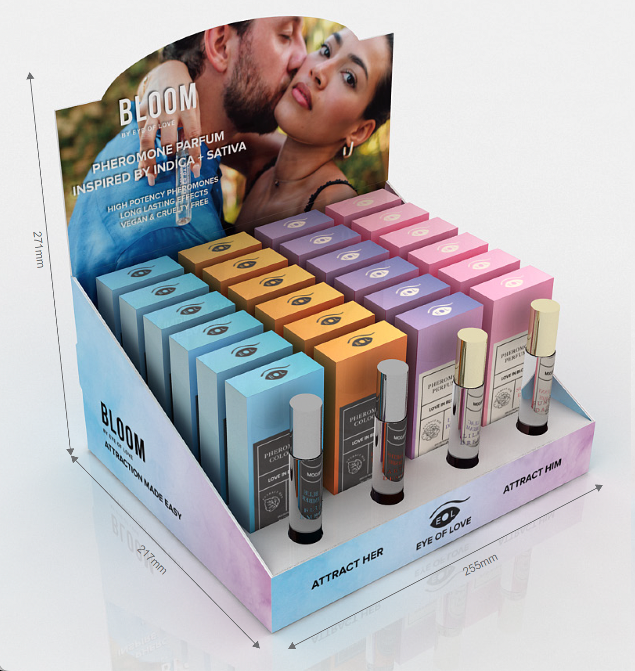 Eye Of Love BLOOM 10ml Display Prepack is a retail ready fragrance assortment designed to create a colorful and engaging in store experience. This 24 piece display includes four BLOOM collection scents, Earths Desire, Blue Ember, Sunny Daze, and Lilac Dream, each offered in 10ml travel size format.
